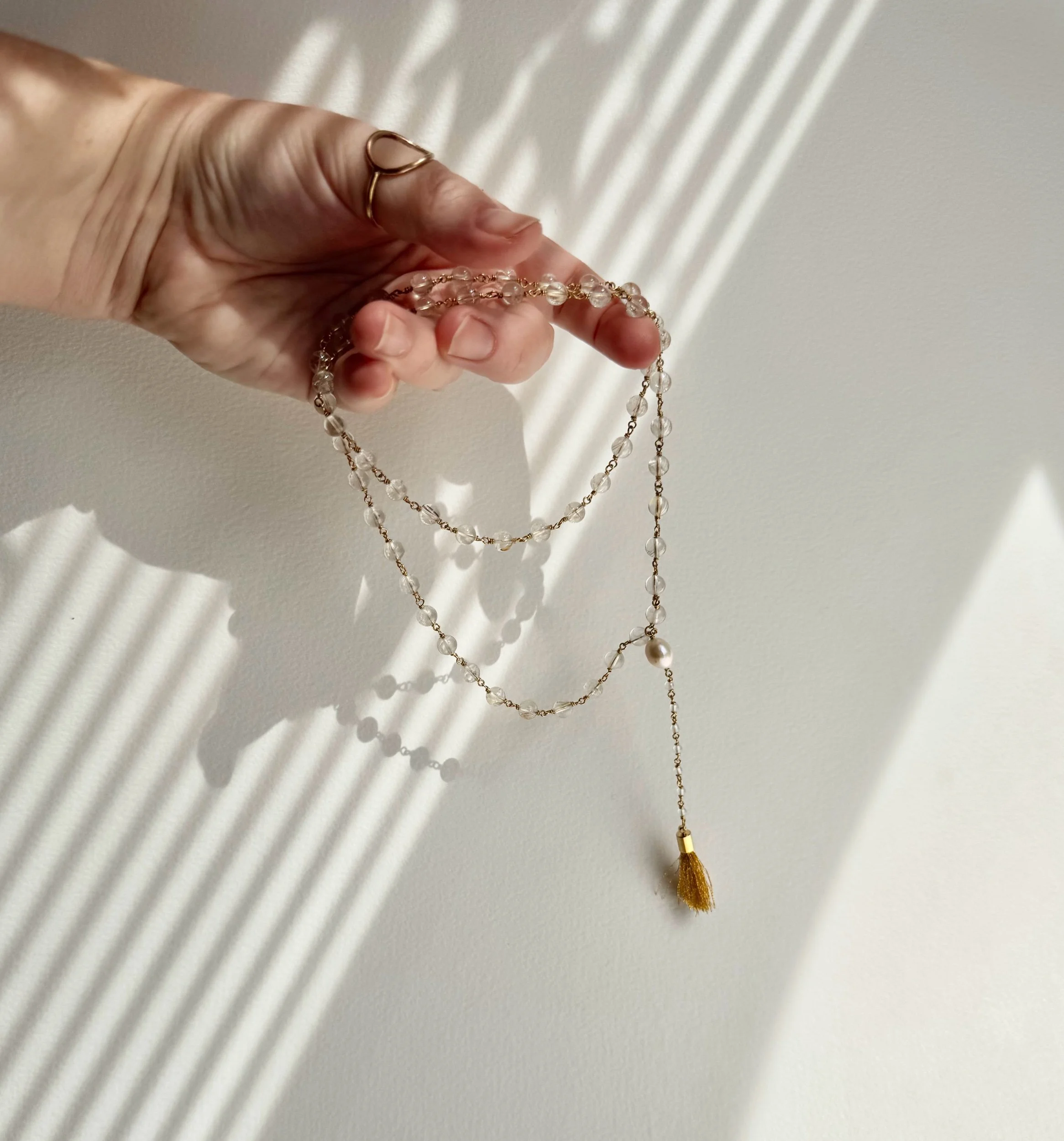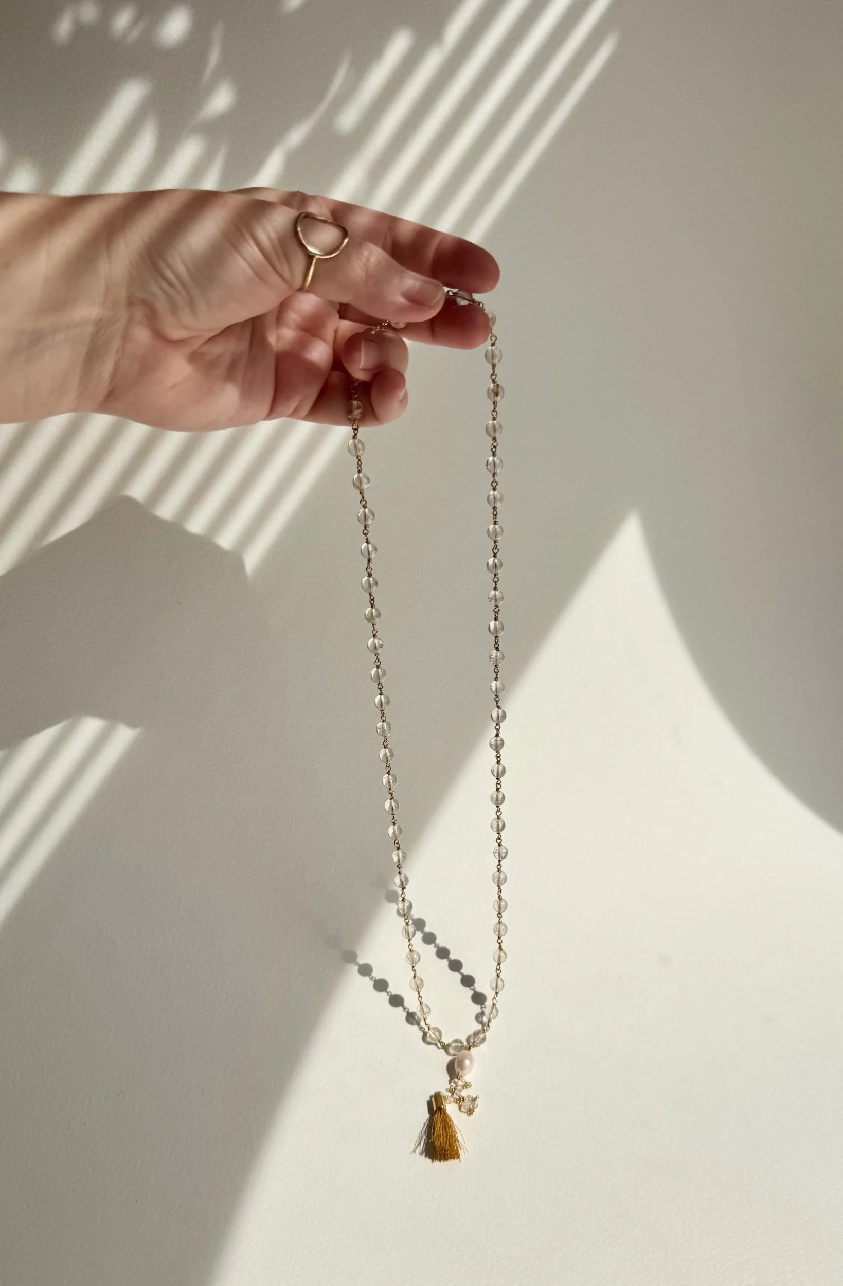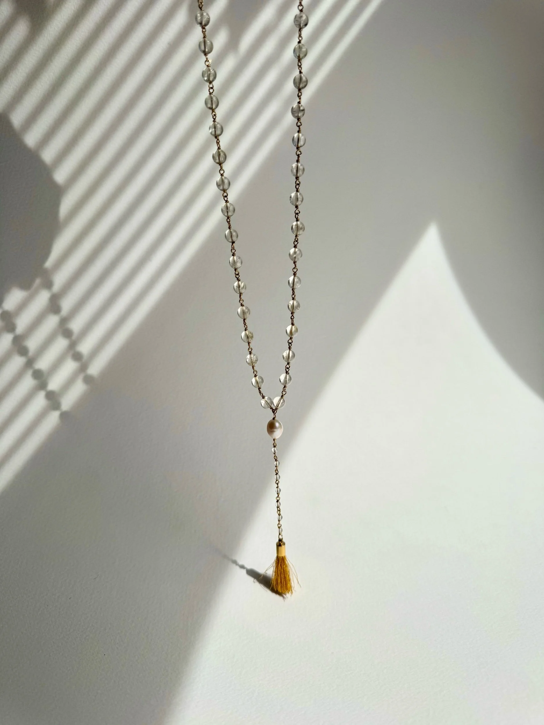 Citrine, clear quartz, fresh water pearl, brass wire and fiber tassel